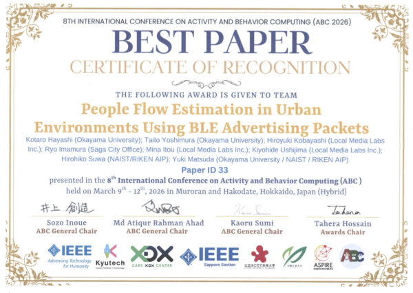 林虎太朗さん(松田研院生)が、3月9日(月)〜12日(木)に北海道室蘭市・函館市で開催されたThe 8th International Conference on Activity and Behavior Computing (ABC 2026) にて、「Best Paper Award」を受賞しました。
