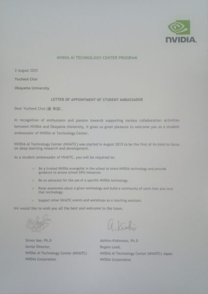 CHOI YU CHEOLさん(高橋研学部生)がNVIDIA学生アンバサダーに任命されました