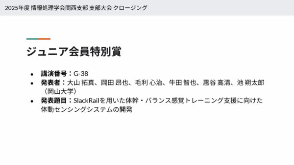 9月28日(日)にオンラインで開催された2025年度情報処理学会関西支部支部大会にて、情報工学先進コース2年生の学生6名が「ジュニア会員特別賞」を受賞しました。本発表は、講義「情報工学探究」での研究成果を発表したものです。